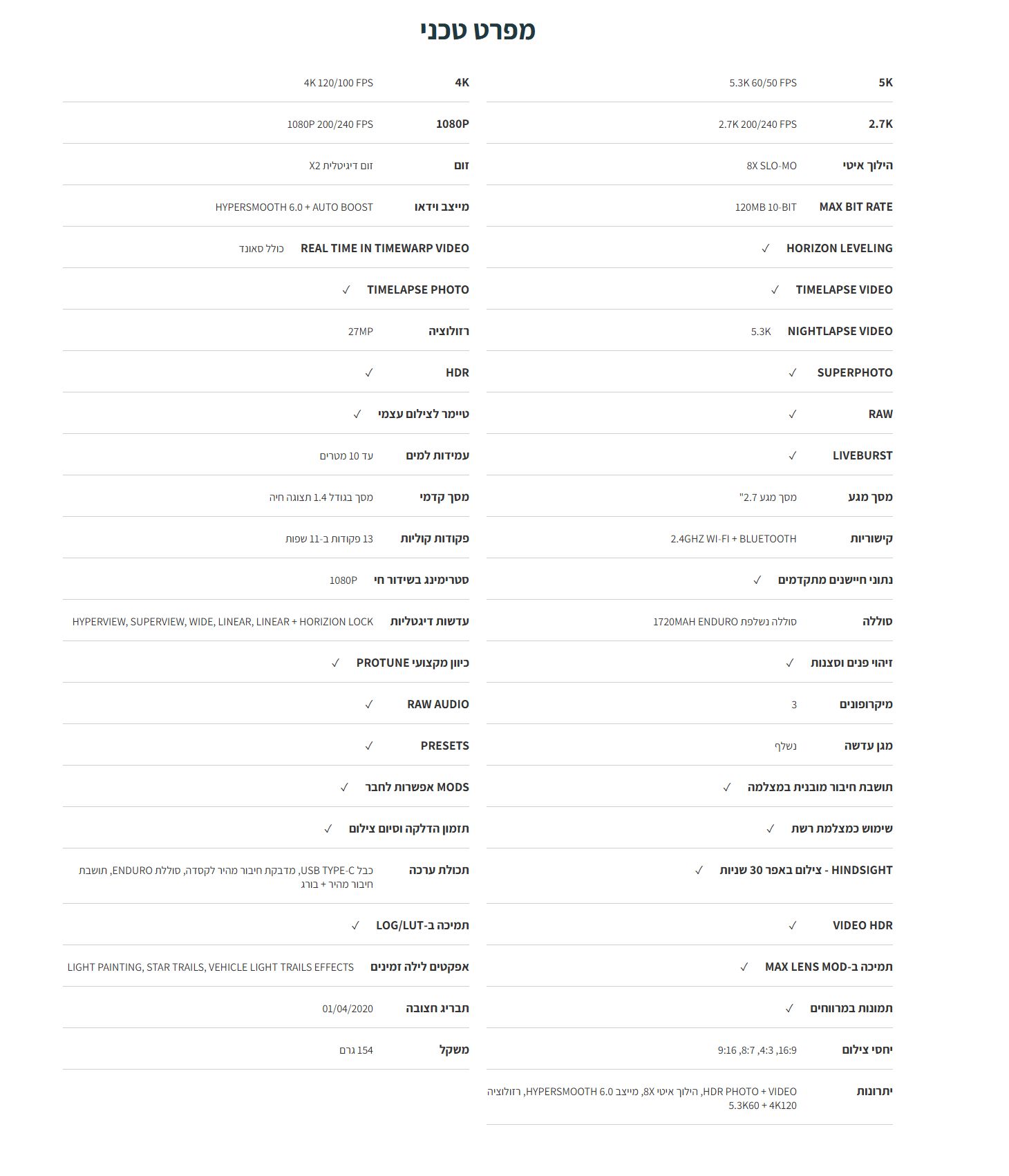 עם צמד מסכים צבעוניים מלפנים ומאחור לכיוון מושלם של זווית הצילום. חיישן הצילום החדשני מאופיין ביחס גובה-רוחב הגדול ביותר אי פעם במצלמות GoPro.