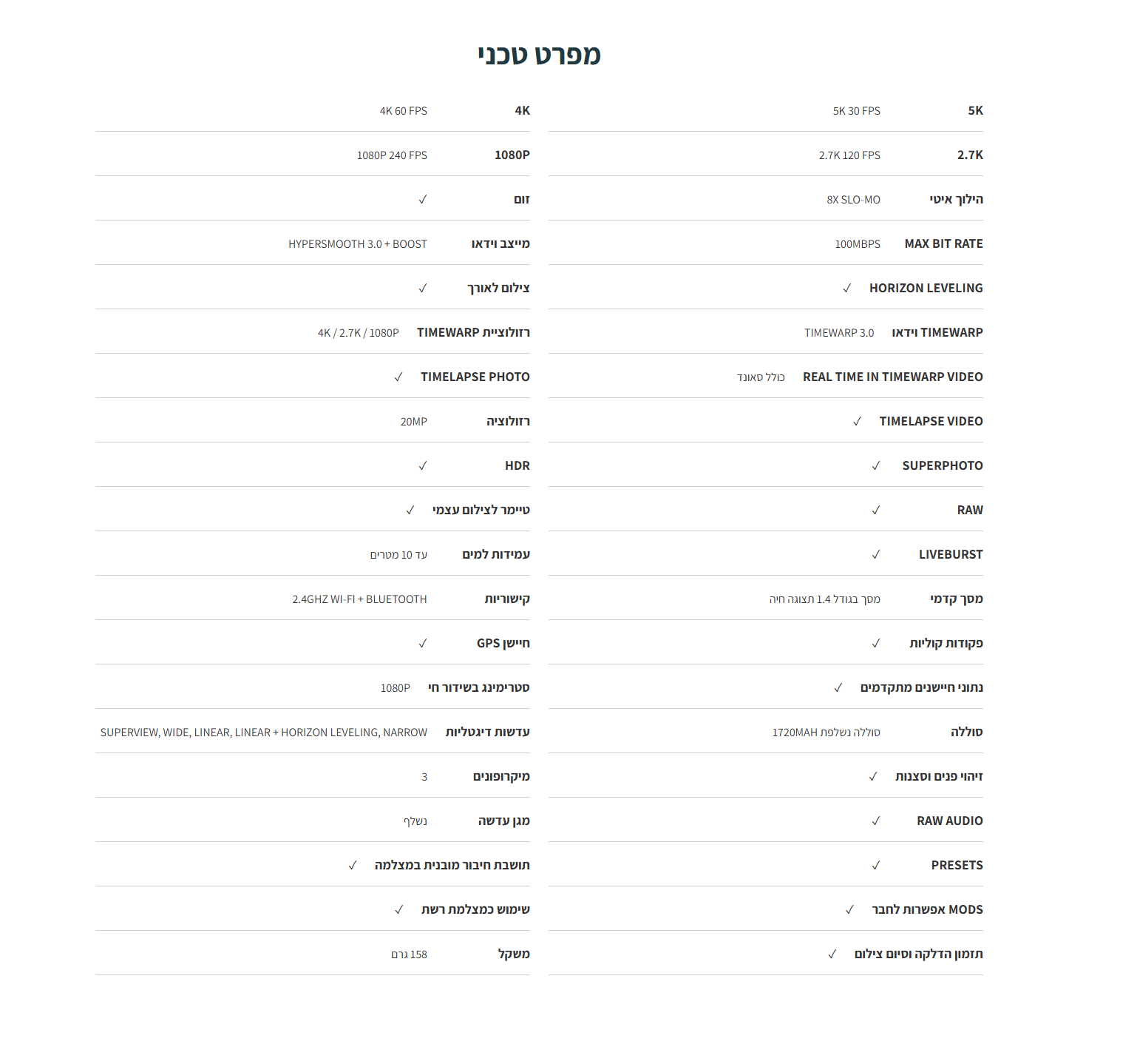 צלמו במצב דולג זמן בזמן שאתם הולכים ברגל, או בכל מקום אחר. באמצעות המייצב, תכנות ה- TimeWarp 3.0 תופס את הזמן כמו שמעולם לא ראיתם. עם אפשרויות חדשות המאפשרות שילוב קטעי וידאו עם סאונד במהלך צילום דולג זמן, ואפשרות לצילום בחצי מהירות. | דילוג בזמן – לילה Time-lapse דילוג בזמן – לילה מאפשר לכם לצלם צילום וידאו מרהיב שמורכב מקיטועי זמן באיכות 4K , 2.7K 4:3 , 1440P או 1080P. כולם מעובדים אוטומטית בתוך המצלמה. | צילום בהילוך איטי הכל נראה מגניב יותר בהילוך איטי. בעזרת קצב פריימים גבוה – 240 פריימים לשניה ב- 1080P עם המייצב הדיגיטלי HyperSmooth 3.0 – מאפשר לכם לצלם במהירות של עד פי 8 מהמהירות הרגילה