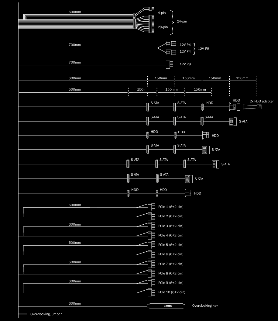התועלת המקסימלית שמעניקים כבלים מודולריים בשרוולים נפרדים של עד 120 ס”מ מפשטת את התקנת הרכיבים ומפחיתה עומס מעצבן. זה מביא לזרימת אוויר מוגברת ולקירור משופר אפילו במארזי המחשב הגדולים ביותר.