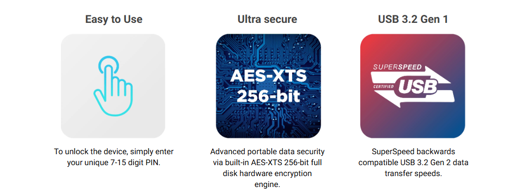| Independent user & admin PINWhich makes it perfect for corporate and government deployment. If the user forgets their PIN, the drive can be unlocked using the admin PIN, the administrator can then allow the user to set a new PIN. OS & platform independentNo software required. Works on any device with a USB port! compatible with: MS Windows, macOS, Linux, Android, Chrome, Thin Clients, Zero Clients, Embedded Systems, Citrix and VMware |