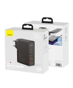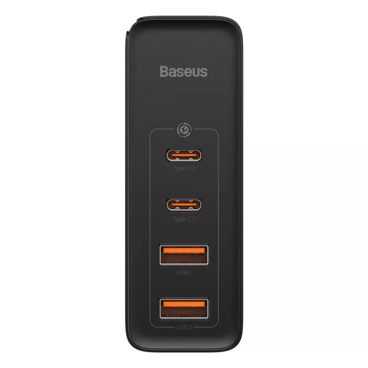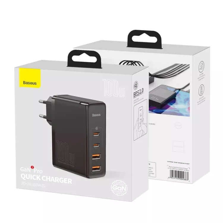 תכונות: מטען קיר מהיר בהספק 100W בחיבור 2X-USB ו 2X-Type-C עם כבל Type-C תקע EU בצבע שחור Baseus | CCGAN2P-L01