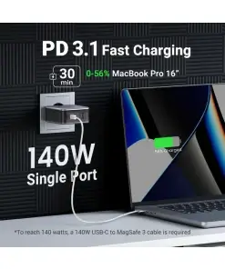 מטען מהיר במיוחד עבור MacBook Pro: עם יציאה אחת, PD 3.1 מגביר את עוצמת הטעינה ל-140W. טוען את MacBook Pro 16 אינץ' עד 56% תוך 30 דקות, פי 1.8 מהר יותר ממטען 65W למחשב נייד USB-C.