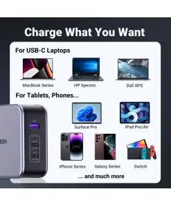 טעינה מרובה יציאות 3 ב-1: שתי יציאות USB-C ויציאת USB-A אחת מאפשרות טעינה בו זמנית של שני מחשבים ניידים וטלפון במהירות הדרושה למשתמש מרובה מכשירים. כולל 5FT 240W כבל טעינה מהירה מסוג C עד C.