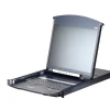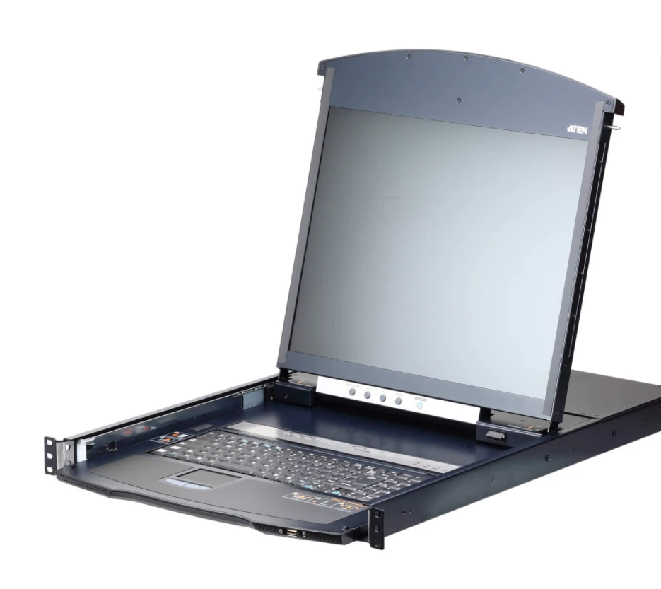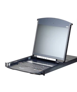 ATEN's KL1108VN 8 יציאות Cat 5 מסילה LCD כפולה KVM מעל IP, כולל צג LCD 19 אינץ 'עם תאורה אחורית LED עם תאורה אחורית, ומקלדת עם לוח מגע מובנה.