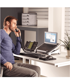 מעמד הגבהה שולחני למחשב נייד עם מגש לאחסון נייר וציוד משרדי, מאפשר להתאים את גובה המחשב לנוחות צפייה מרבית ב 6 מצבי גובה שונים, מעמד הגבהה עם קצה קדמי מונע החלקה של המחשב הנייד, מעמד הגבהה Fellowes | DER8032001 הארגונומי מאושר ומוסמך על פי BS EN ISO 9241 על ידי FIRA international, מסמיך ארגונומי עצמאי.