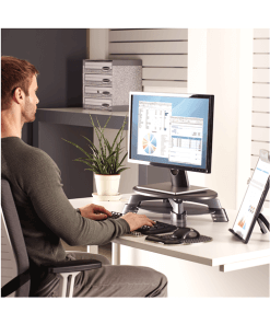 מעמד הגבהה מסתובב למסך עם מגש לאחסון נייר וציוד משרדי, מאפשר להתאים את גובה המסך לנוחות צפייה מרבית ב 3 מצבי גובה שונים, מעמד הגבהה קומפקטי מסתובב 45° לצפייה משותפת ותופס שטח מינימלי על שולחן העבודה, מעמד הגבהה Fellowes | DER91450 הארגונומי מאושר ומוסמך על פי BS EN ISO 9241 על ידי FIRA international, מסמיך ארגונומי עצמאי.