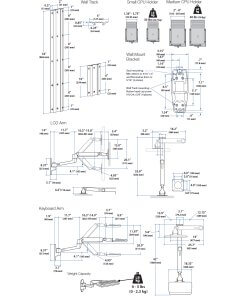 - כולל רצועות קיר בגודל 10 אינץ' ו- 34 אינץ' עם שני כיסויי מסלול שחורים, זרוע LCD עם עמידה על קיר LX, זרוע מקלדת לשבת בעמידה, משענת שורש כף היד, מחזיק עכבר, מחזיק מעבד בינוני, שני ערוצי כבלים בגודל 10 אינץ', ערכות הרכבה לחלול – התקנת קיר וקיר