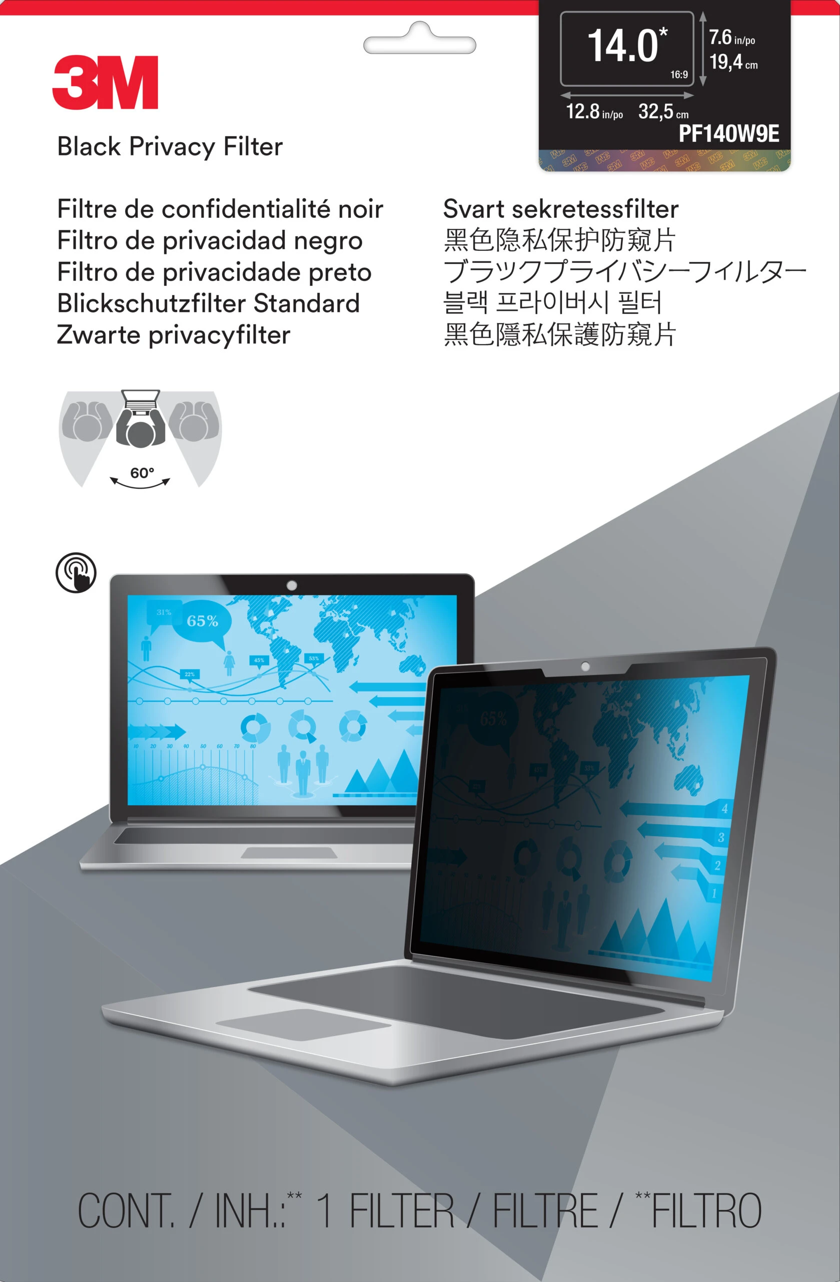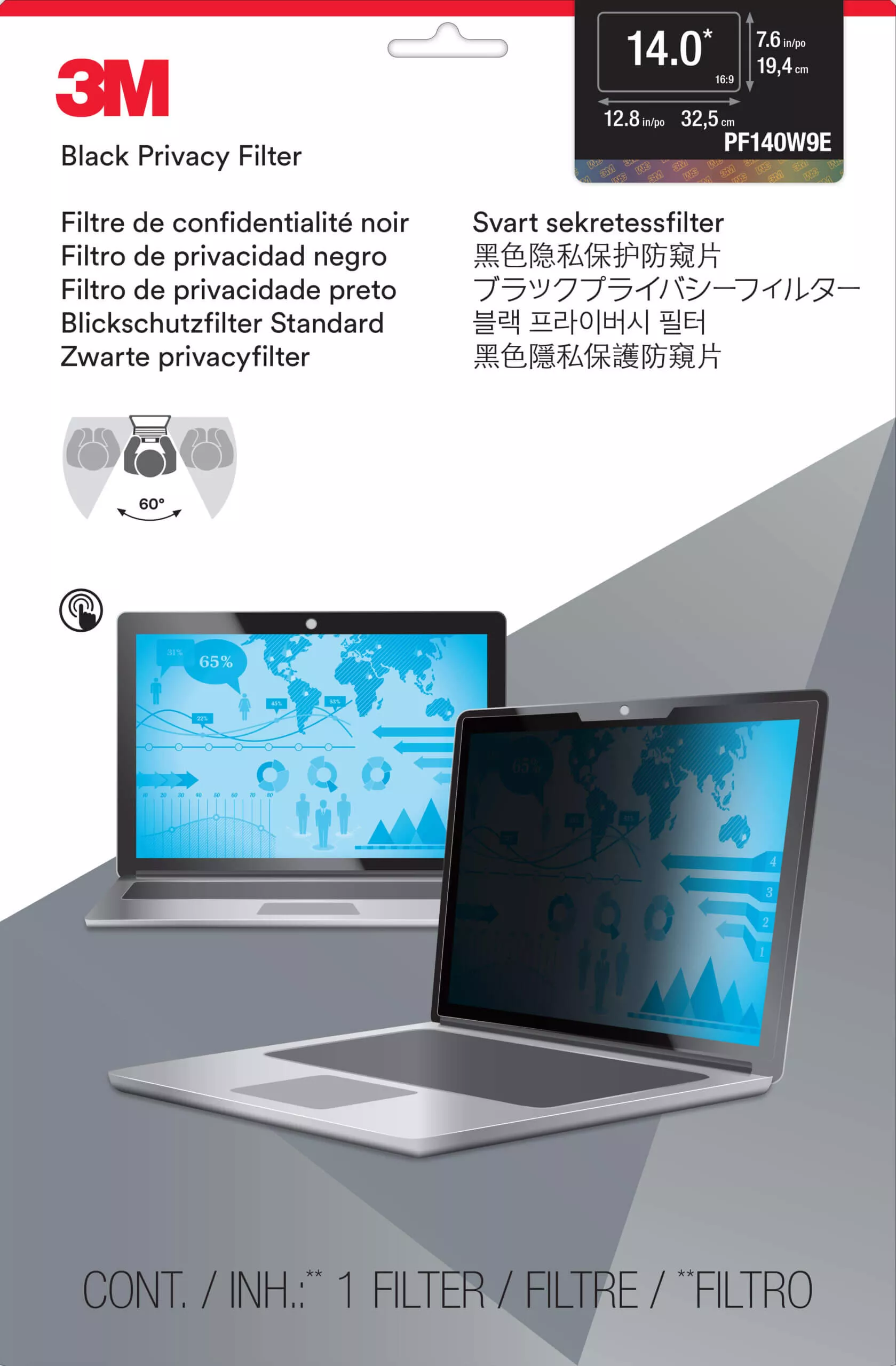תכונות: מגן פרטיות למחשב נייד מסך טאץ' 3M™ | PF140W9E | Touch Privacy Filter for 14.0 Edge-to-Edge