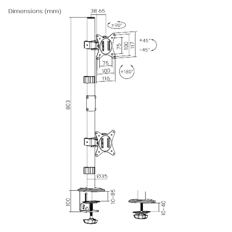 - Desktop Thickness: Clamp:10~85mm / Grommet: 10~40mm